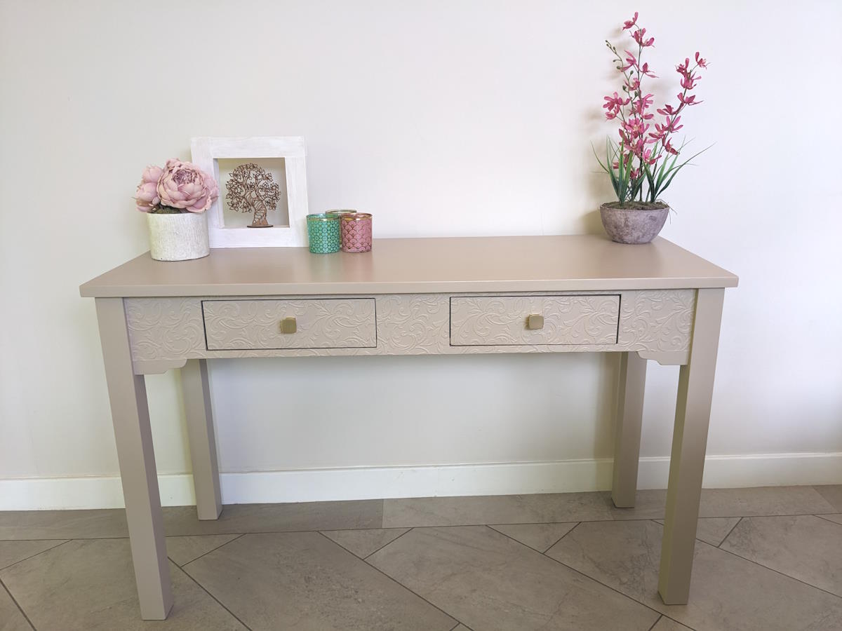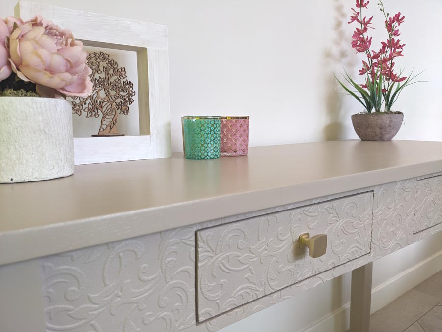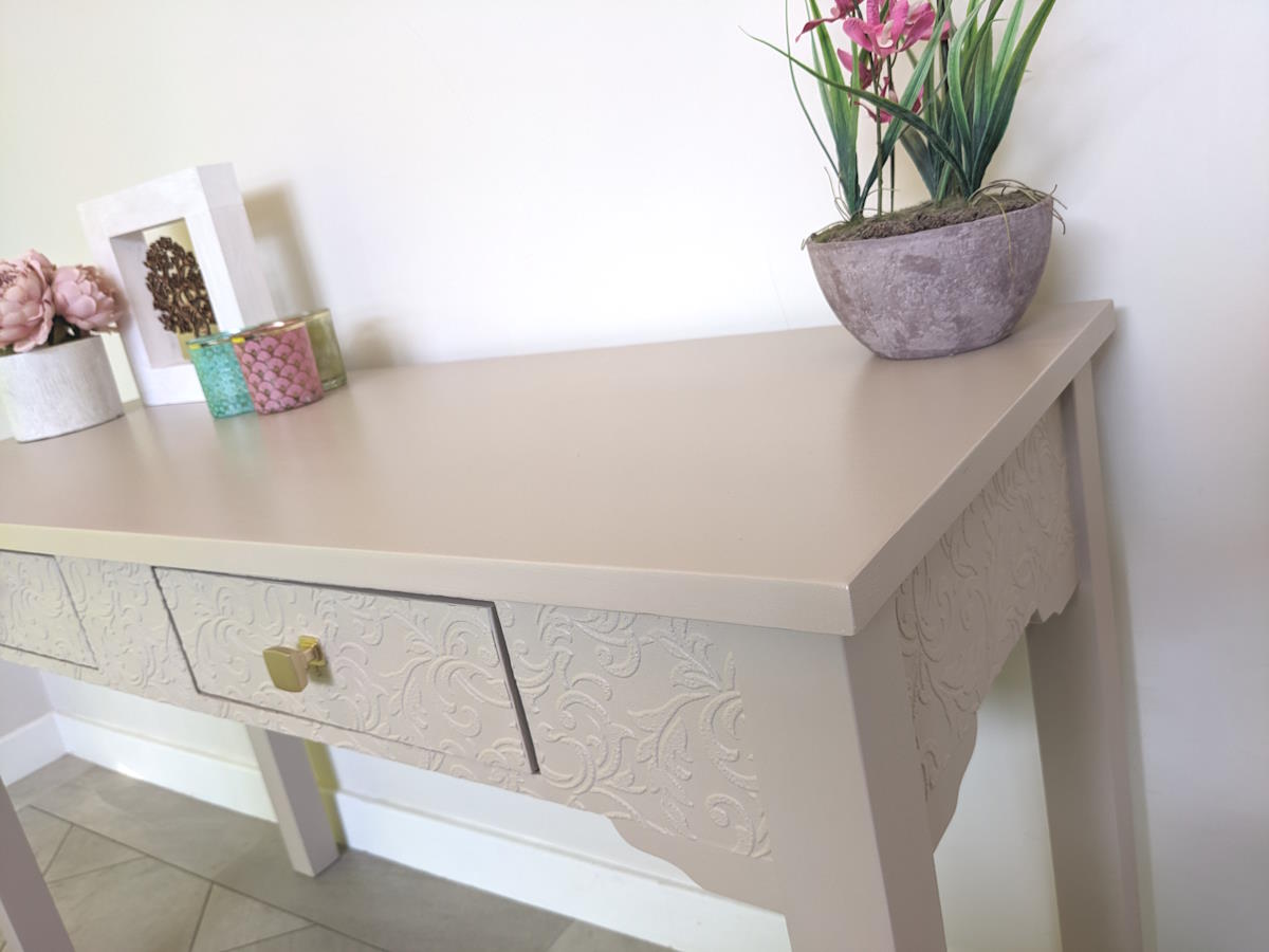 Console table upcycled with Fusion Cathedral Taupe paint and textured floral wallpaper